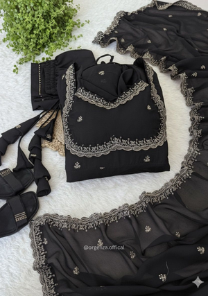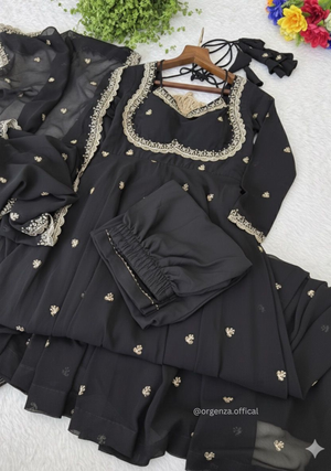 Material: Gown- Heavy Quality Fox Georgette Fabric, Inner- Pure Microscrape Full Lining, Dupatta- 2.20 Mtr Soft Fox Georgette Heavy Four Side Sequence Embroidery Lace Borders, Full Dupatta Allover Butti Sequence Work, Pant- American Crepe Heavy Quality 10:30 Kg Length 39 In, Samosa Lace