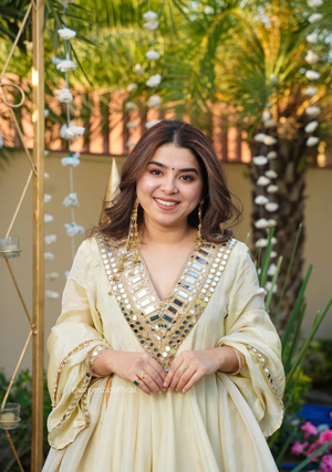 Material: Kediya- Cosmos Gold Jari Silk Embroidery Work With Real Mirror Work Lace Border, inner - heavy micro Cotton, Bottom - Cosmos Gold Jari Silk +Full Flair, Dupatta - Cosmos Gold Jari With Lace Border Work