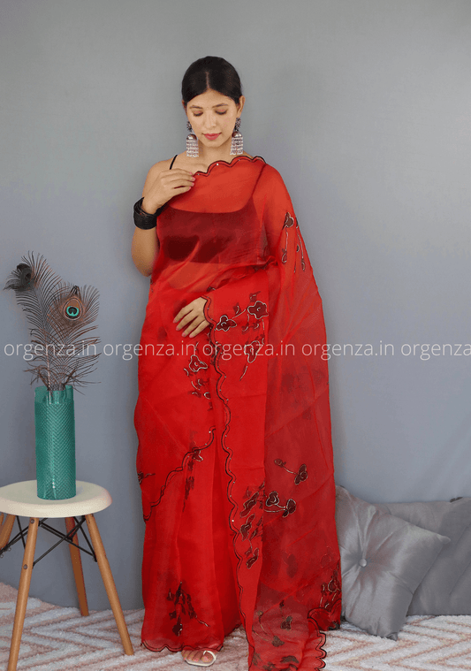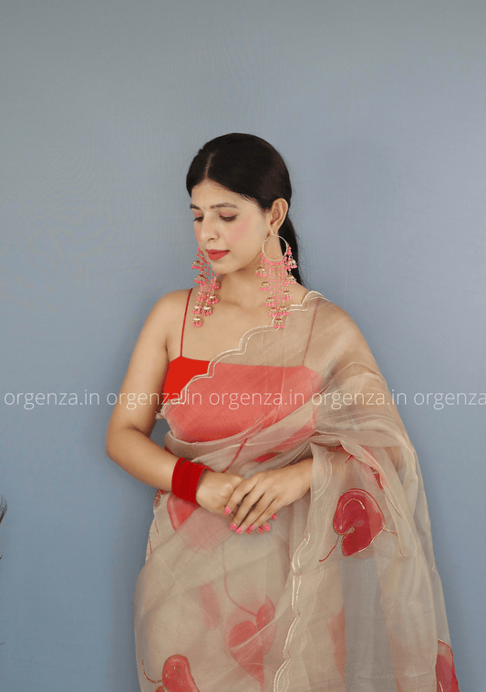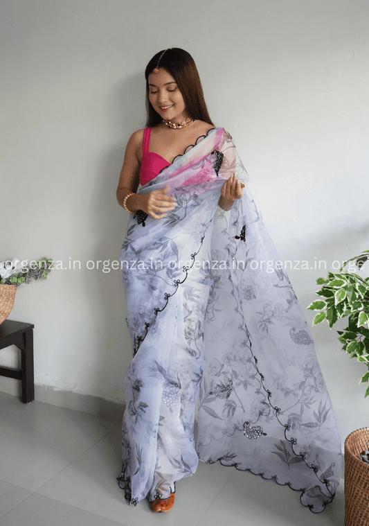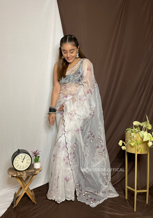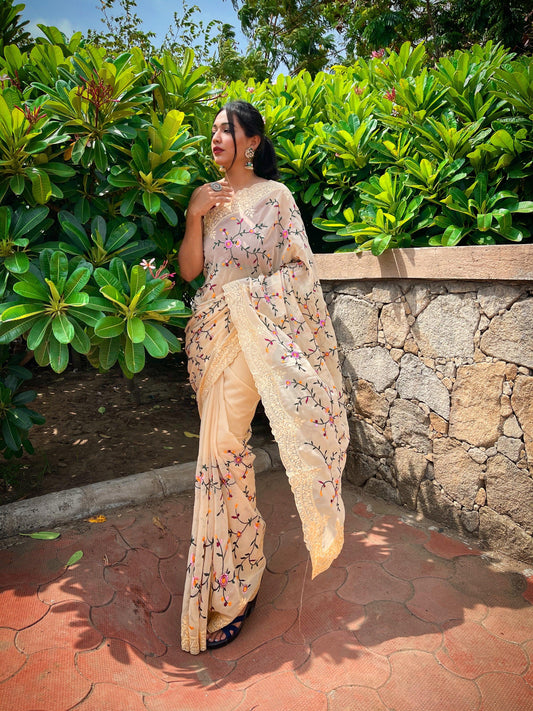 Orgenza || Pearl Cream Color Heavy Pure Georgette Silk Border Cutwork And Embroidery Work Saree With Contrast Blouse