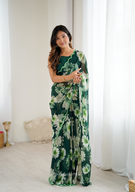 Green Colour Georgette Printed Mirror Saree