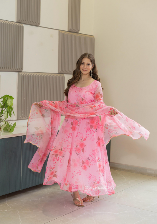Baby Pink Colour Pure Organza Silk Floral Anarkali Kurtis