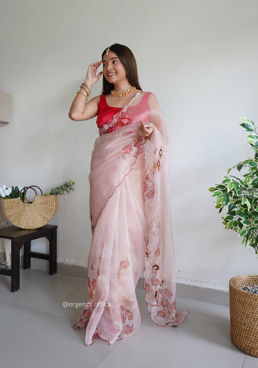 Baby Pink Colour Cotton Saree With Lotus Print Blouse