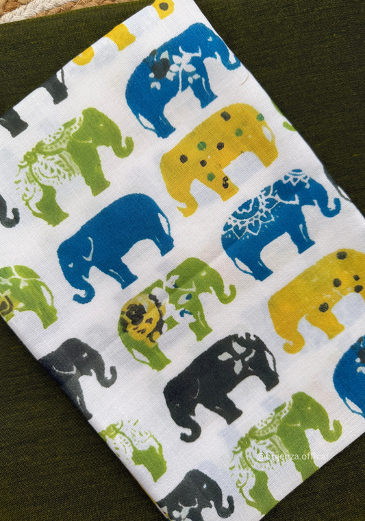 Rama Green Colour Cotton Saree With Baby Elephant Print Blouse