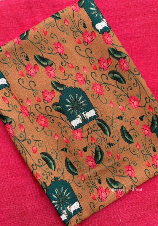 Green Colour Cotton Saree With Pink Flower Print Blouse
