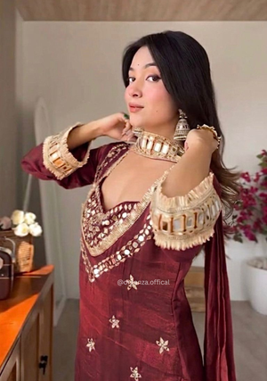 Step into timeless ethnic charm with this beautifully crafted Fendy Silk Sharara Set, designed with real mirror work and elegant lace border for a rich festive and wedding-ready look. This outfit blends traditional craftsmanship with modern comfort, making it a perfect choice for special occasions.