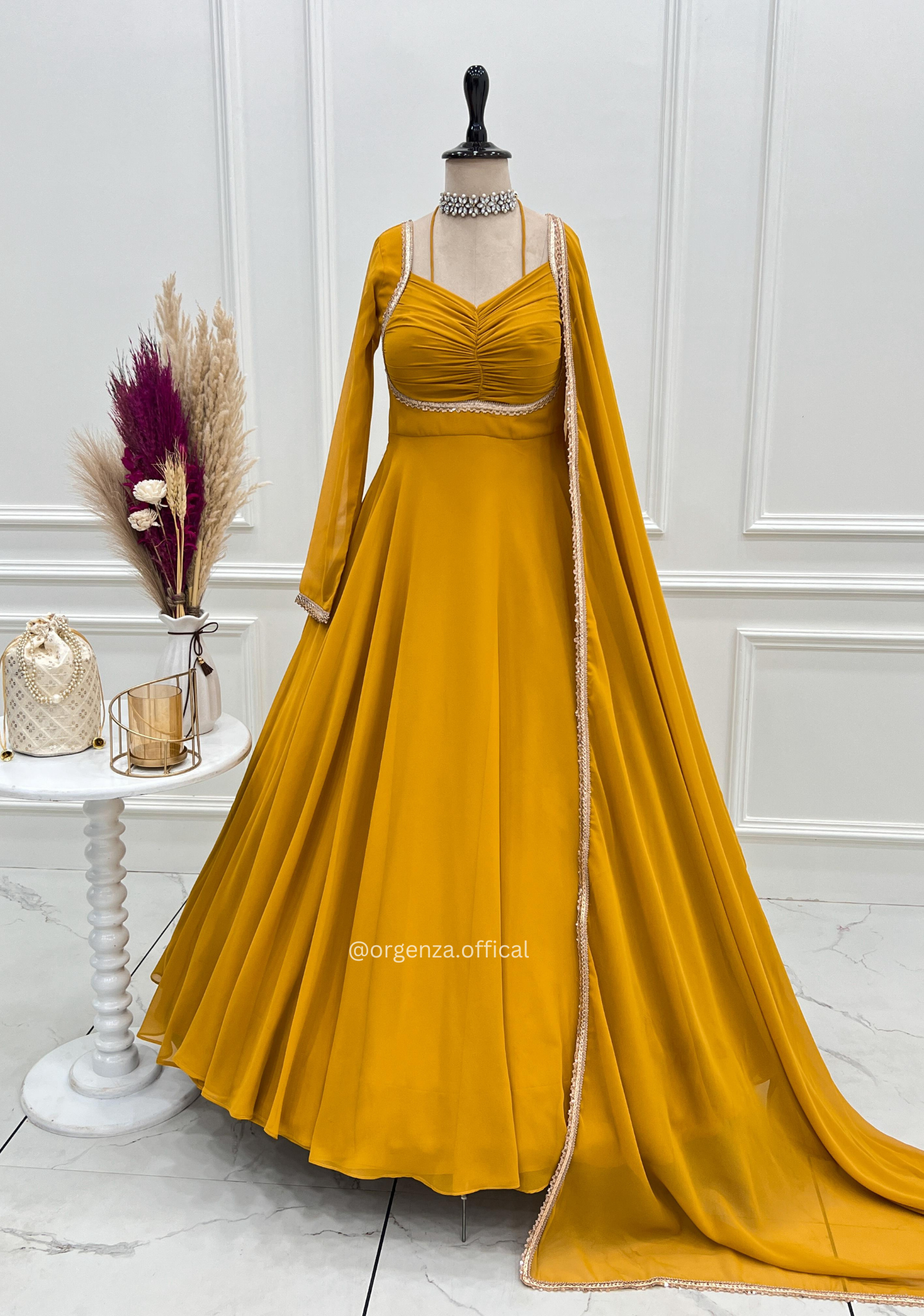 The gown is beautifully detailed with a fancy designer dori yoke, padded bodice, and full sleeves for a premium look. It comes with a micro cotton full inner lining for maximum comfort and a matching 2.2 meter georgette dupatta with lace border to complete your ethnic style.