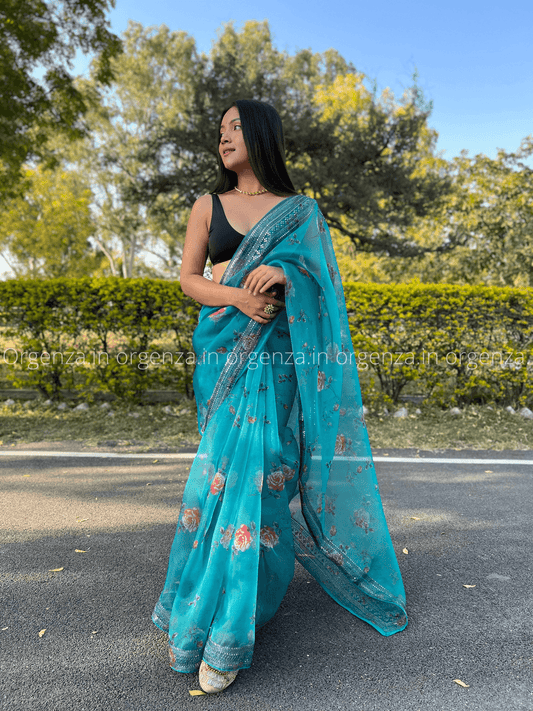 Orgenza || Banno Tame Teal Color Leheriya Design Embroidery Work Pure Organza Silk Saree With Blouse