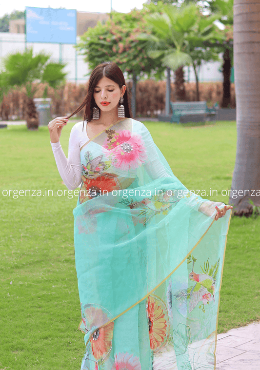 Light Teal Organza Saree With Embroidery Work