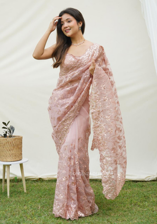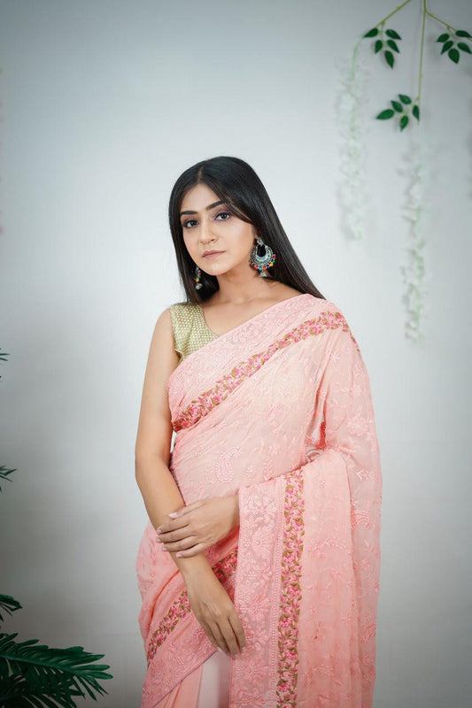 Peach Color Embroidery Work Heavy Georgette Silk Saree With Running Blouse