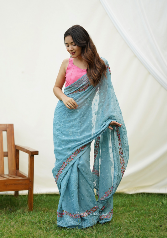 Sky Color Embroidery Work Heavy Georgette Silk Saree With Running Blouse