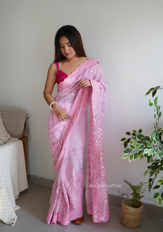 Baby Pink Colour Jimmy Choo Saree With Mirror Work