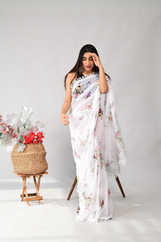 Orgenza | White Color Georgette Soft Silk Printed And GPO Lace All Over Saree With Contrast Blouse