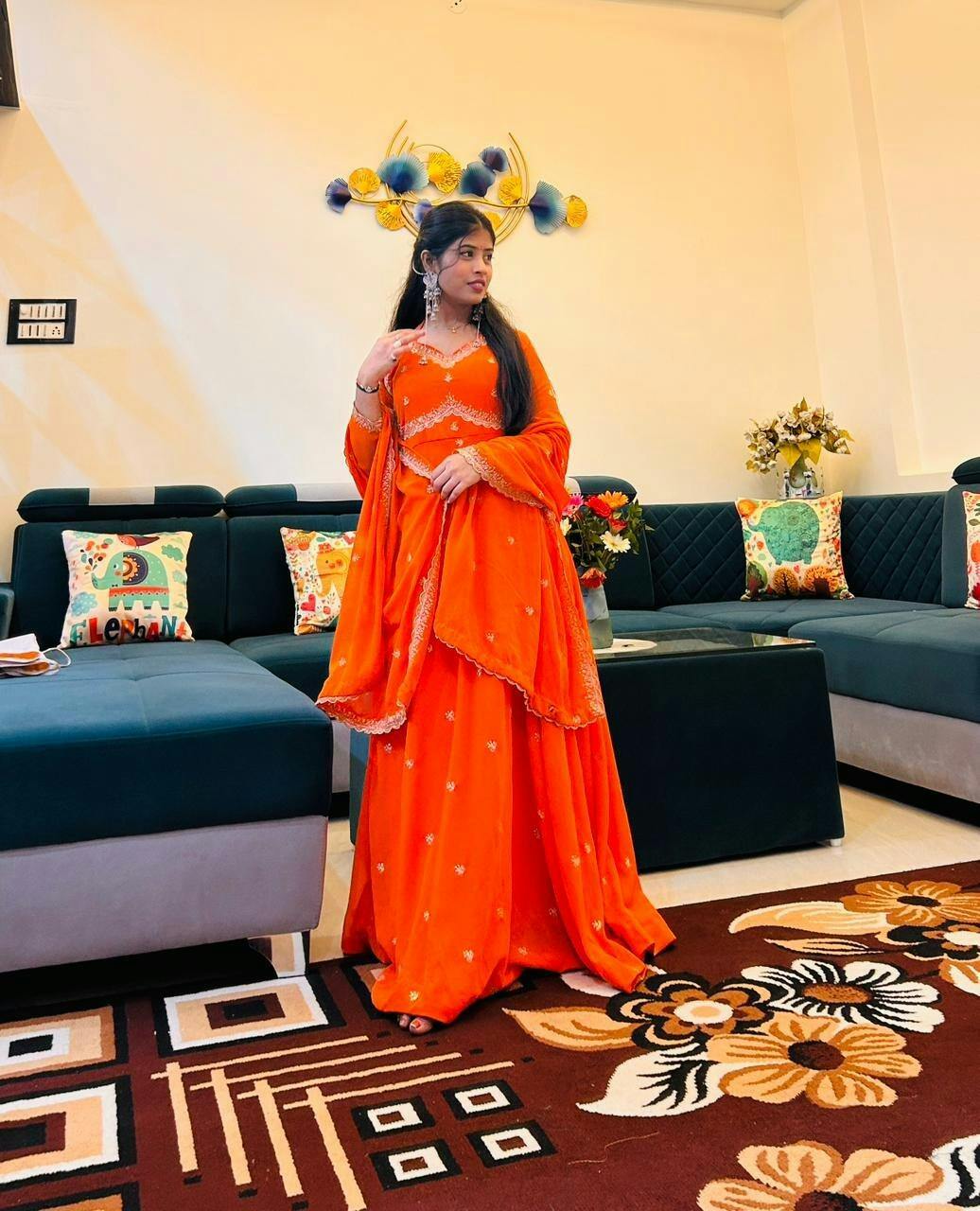 Material: Gown- Heavy Quality Fox Georgette Fabric, Inner- Pure Microscrape Full Lining, Dupatta- 2.20 Mtr Soft Fox Georgette Heavy Four Side Sequence Embroidery Lace Borders, Full Dupatta Allover Butti Sequence Work, Pant- American Crepe Heavy Quality 10:30 Kg Length 39 In, Samosa Lace
