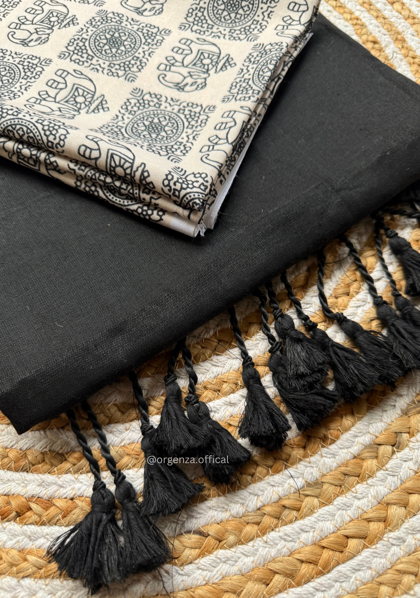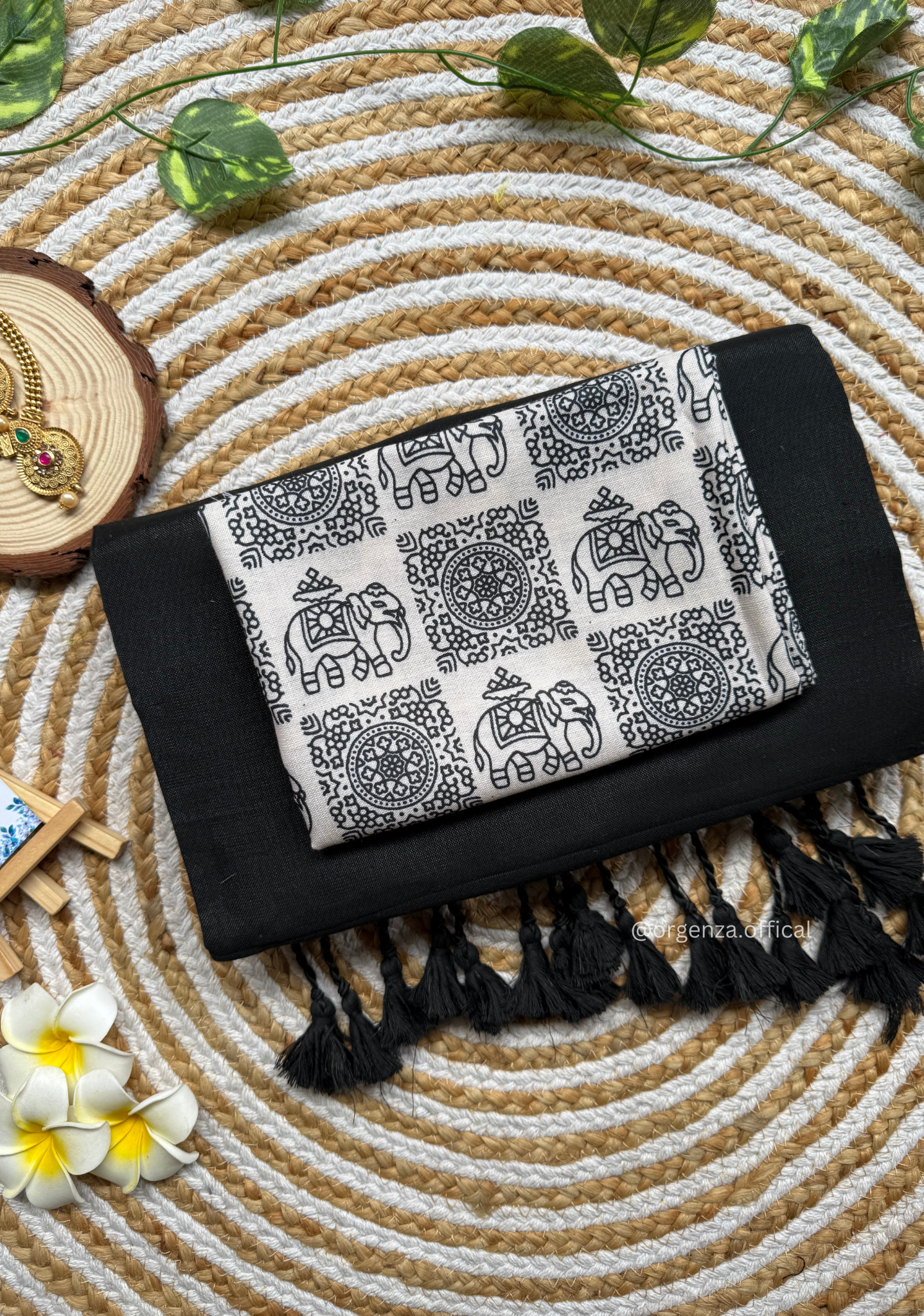 Black Colour Cotton Saree With White Elephant Print Blouse