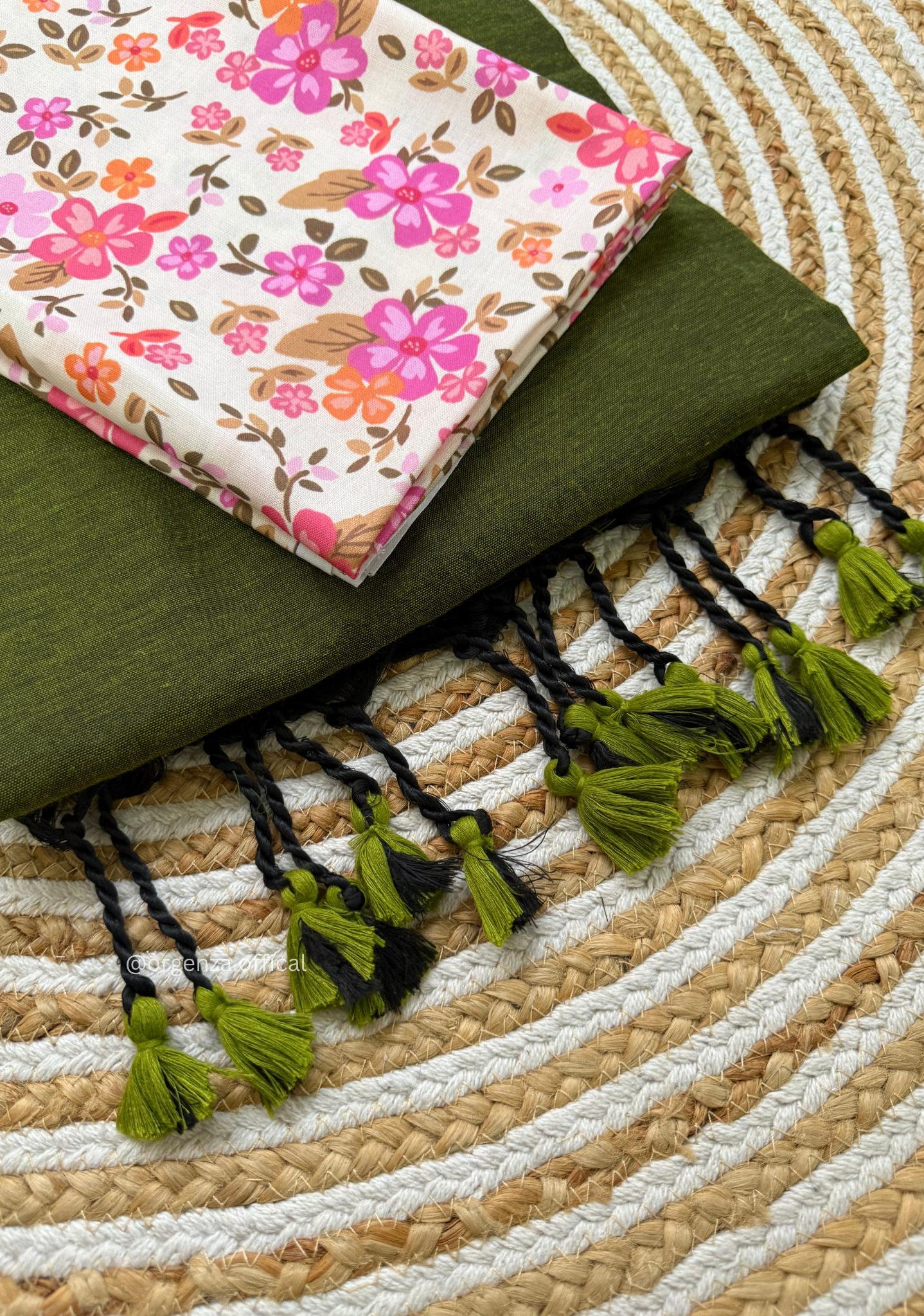 Dark Mehendi Green Colour Cotton Saree With Multi Flower Print Blouse