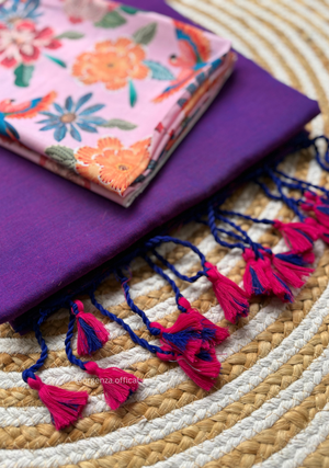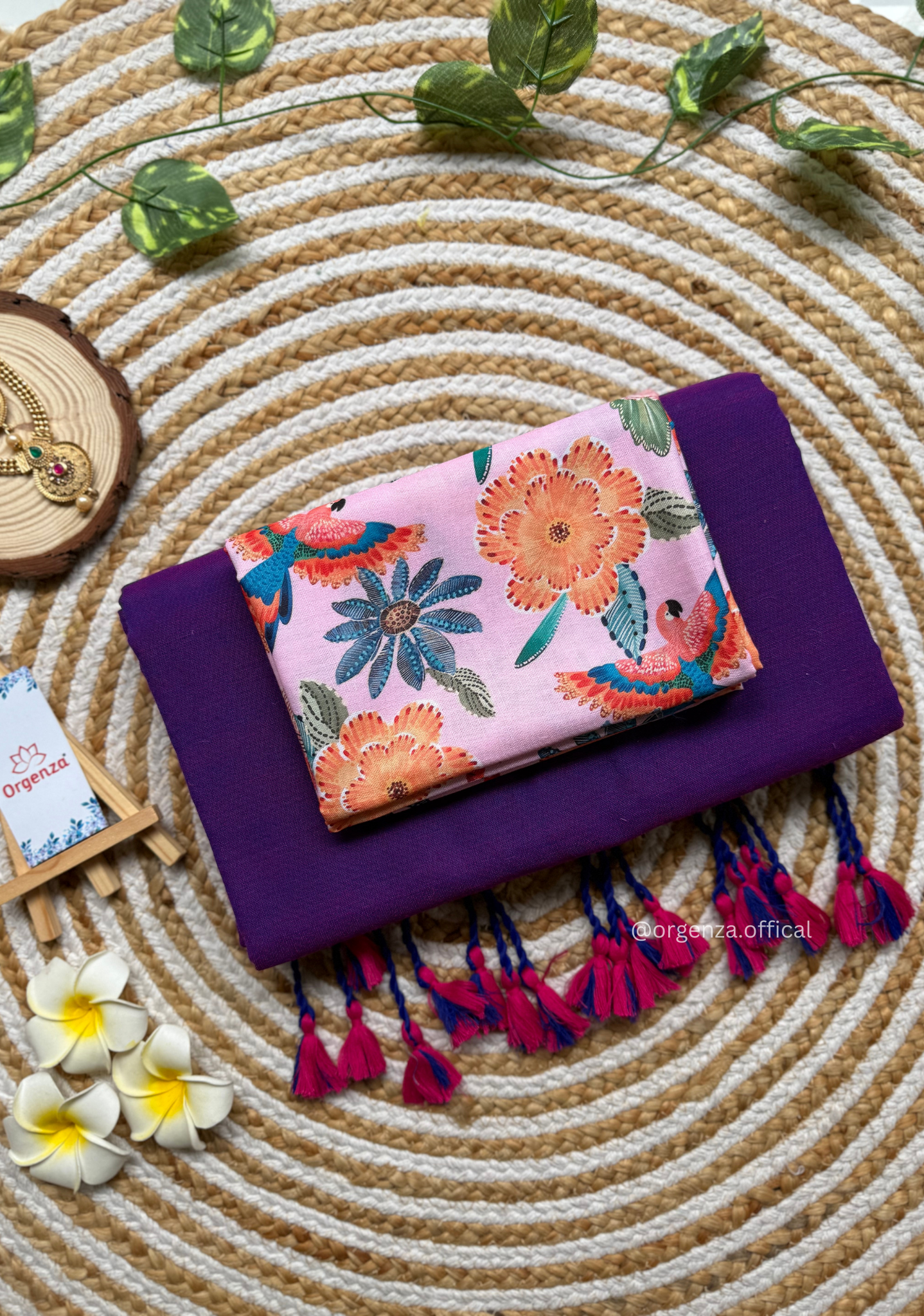 Dark Purple Colour Cotton Saree With Flower Print Blouse