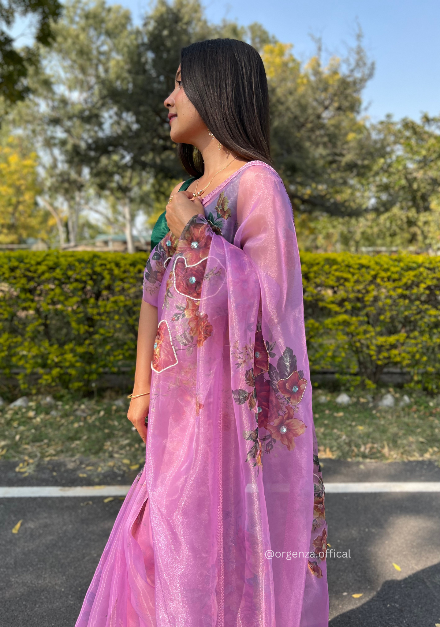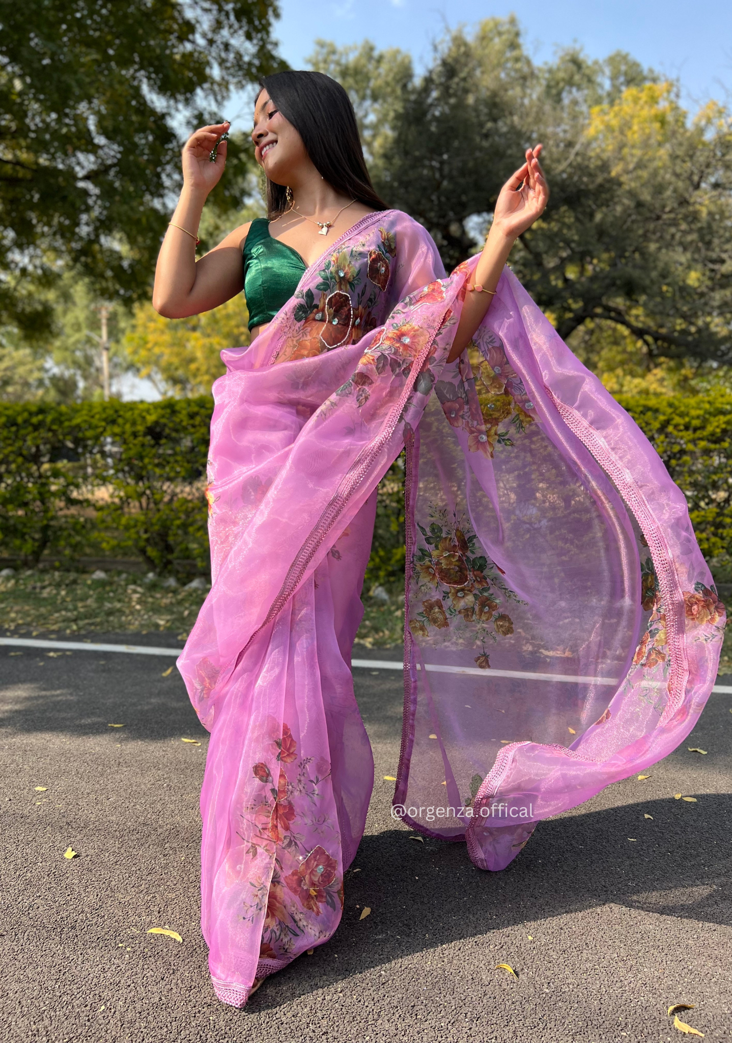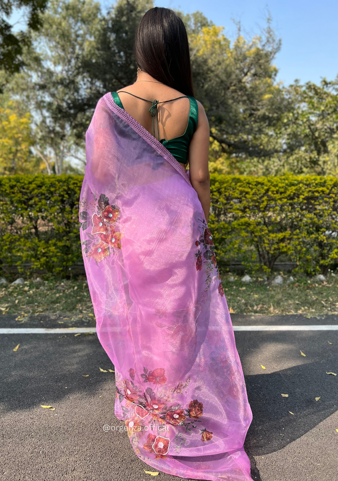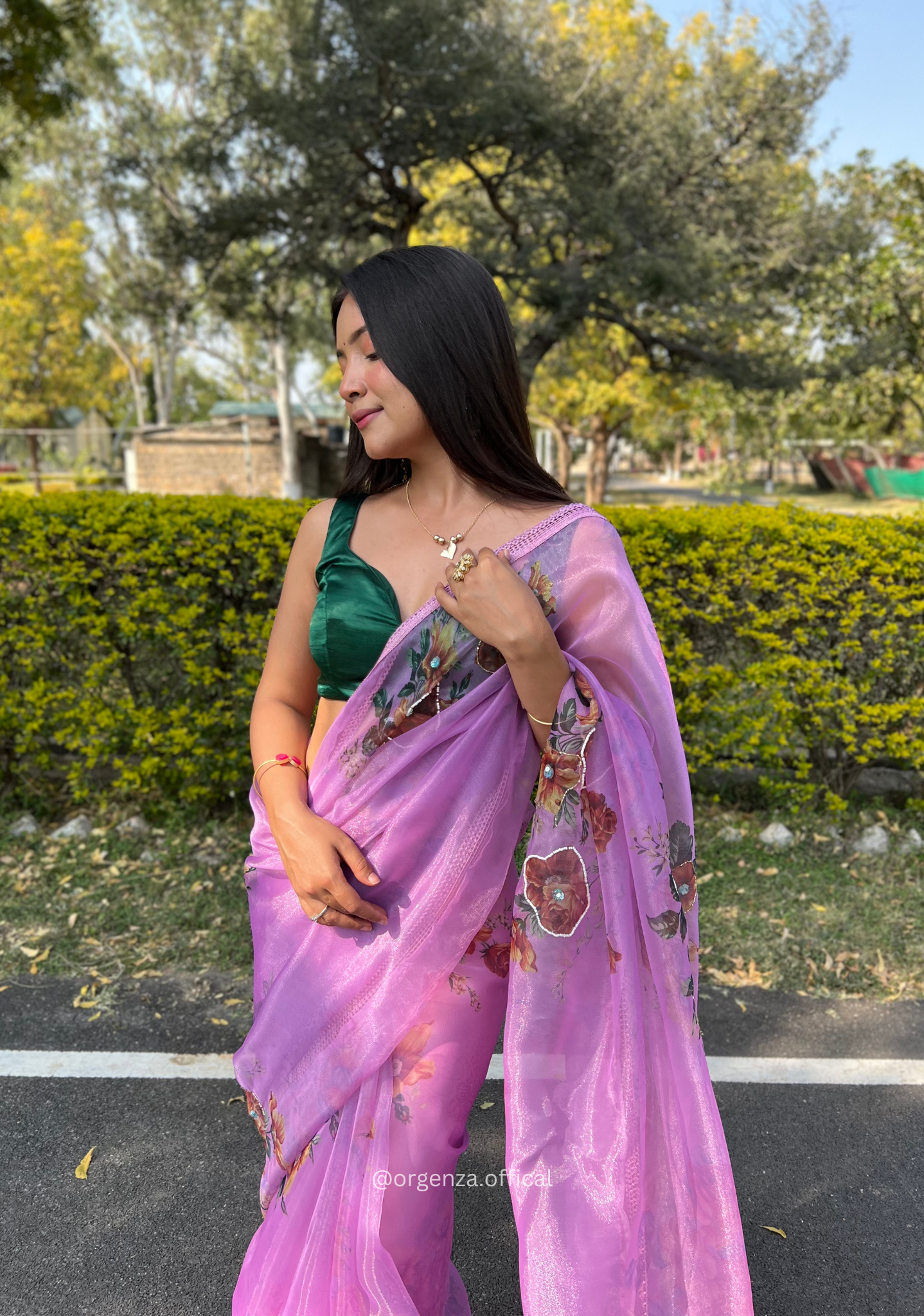 Orgenza Sky Purple Color Pure Organza Silk And Stone Work And Printed Flower Saree With Contrast Blouse