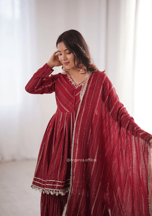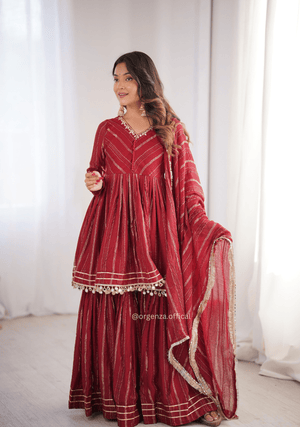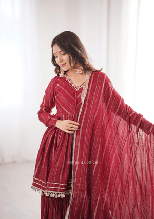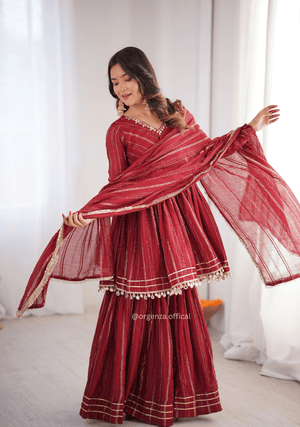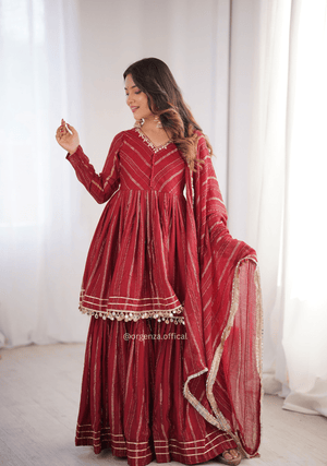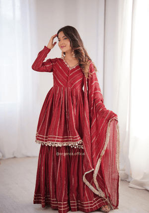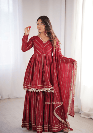 Add timeless elegance to your wardrobe with this stunning Mal Chanderi Sharara Set, designed with real mirror handwork and elegant lace border detailing. This outfit is perfect for festive occasions, weddings, and traditional celebrations. The rich fabric, comfortable inner lining, and graceful full-flare sharara create a royal and stylish ethnic look.