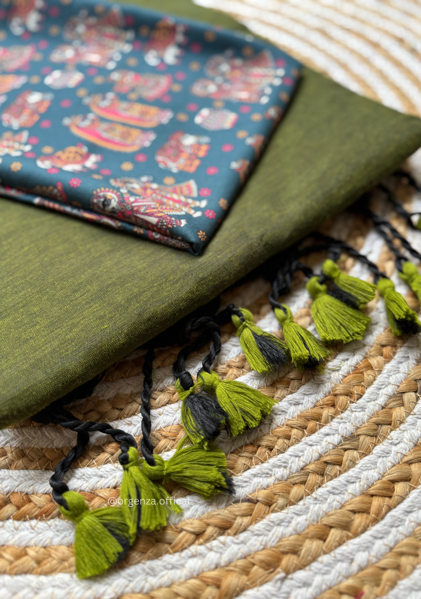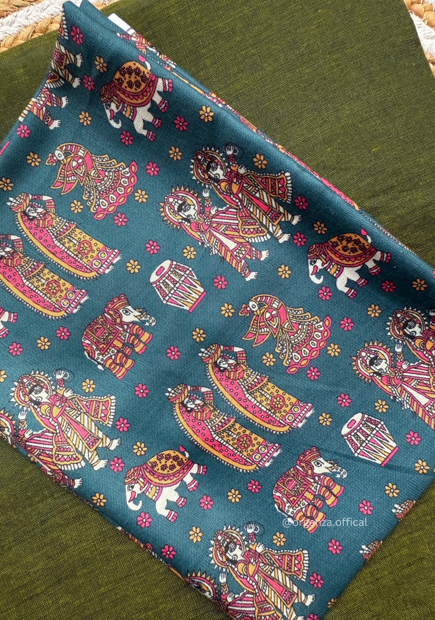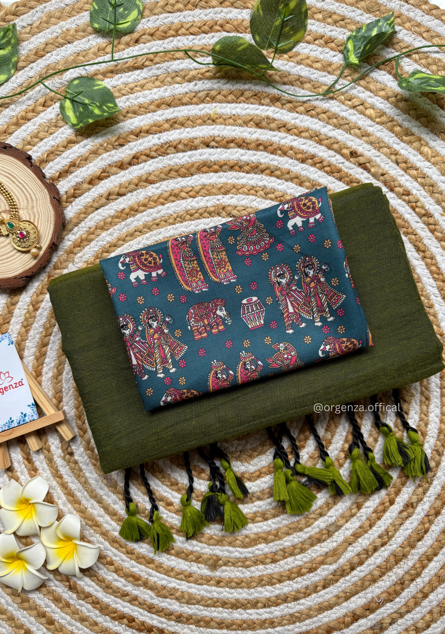 Dark Mehendi Green Colour Cotton Saree With People Print Blouse
