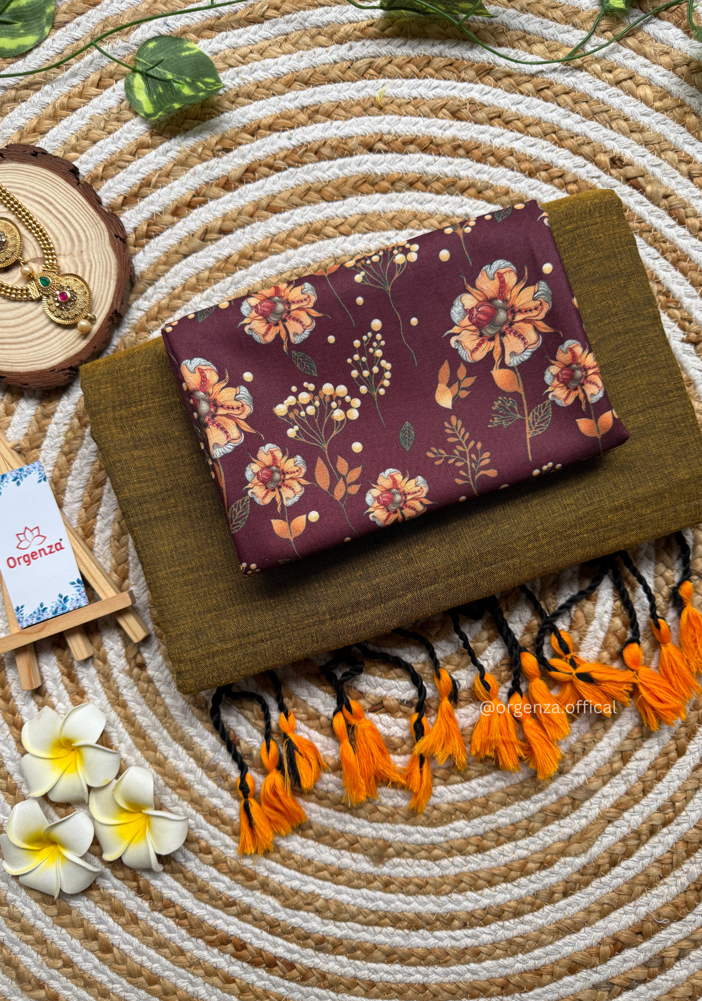 Mustered Yellow Colour Cotton Saree With Wine Floral print Blouse