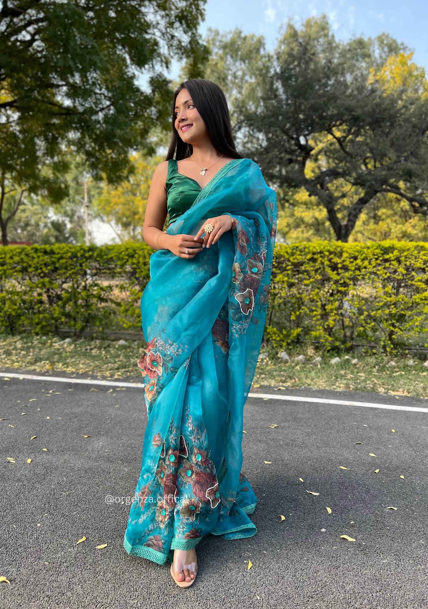 Orgenza Light Sky Color Pure Organza Silk And Flower Embroidery Work With Contrast Blouse