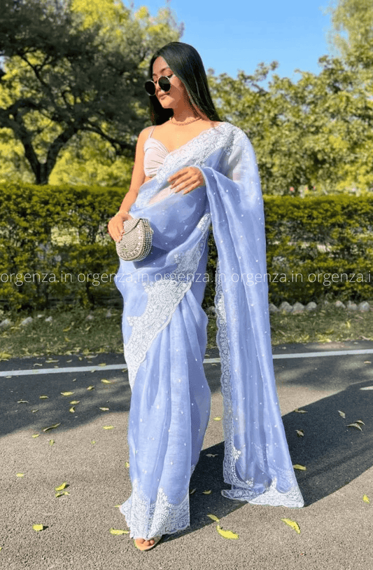 Orgenza Light Sky Color Pure Organza Silk And Flower Embroidery Work With Contrast Blouse