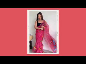 *Organza Silk and the making being hand painted loveliness. This gorgeous Organza Saree with handprints foil motif all over is splendiferous and the contrast of is beautiful. This floaty, fine-spun organza saree mesmerizes your eyes on you. Moreover, Organza is one of the priorities when dressing up for occasions.