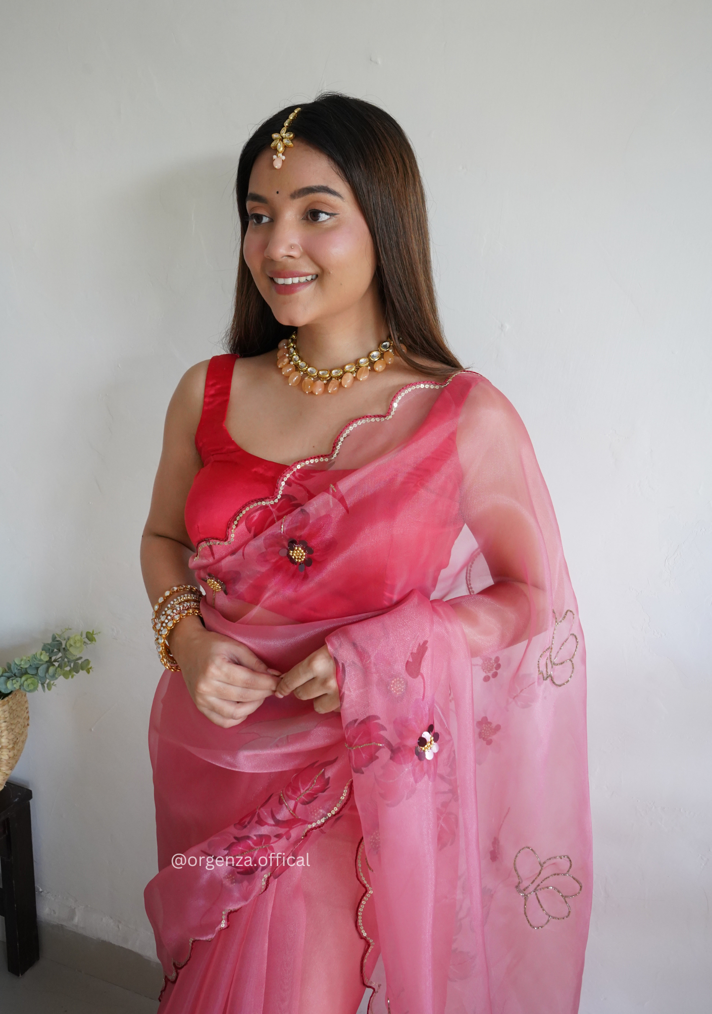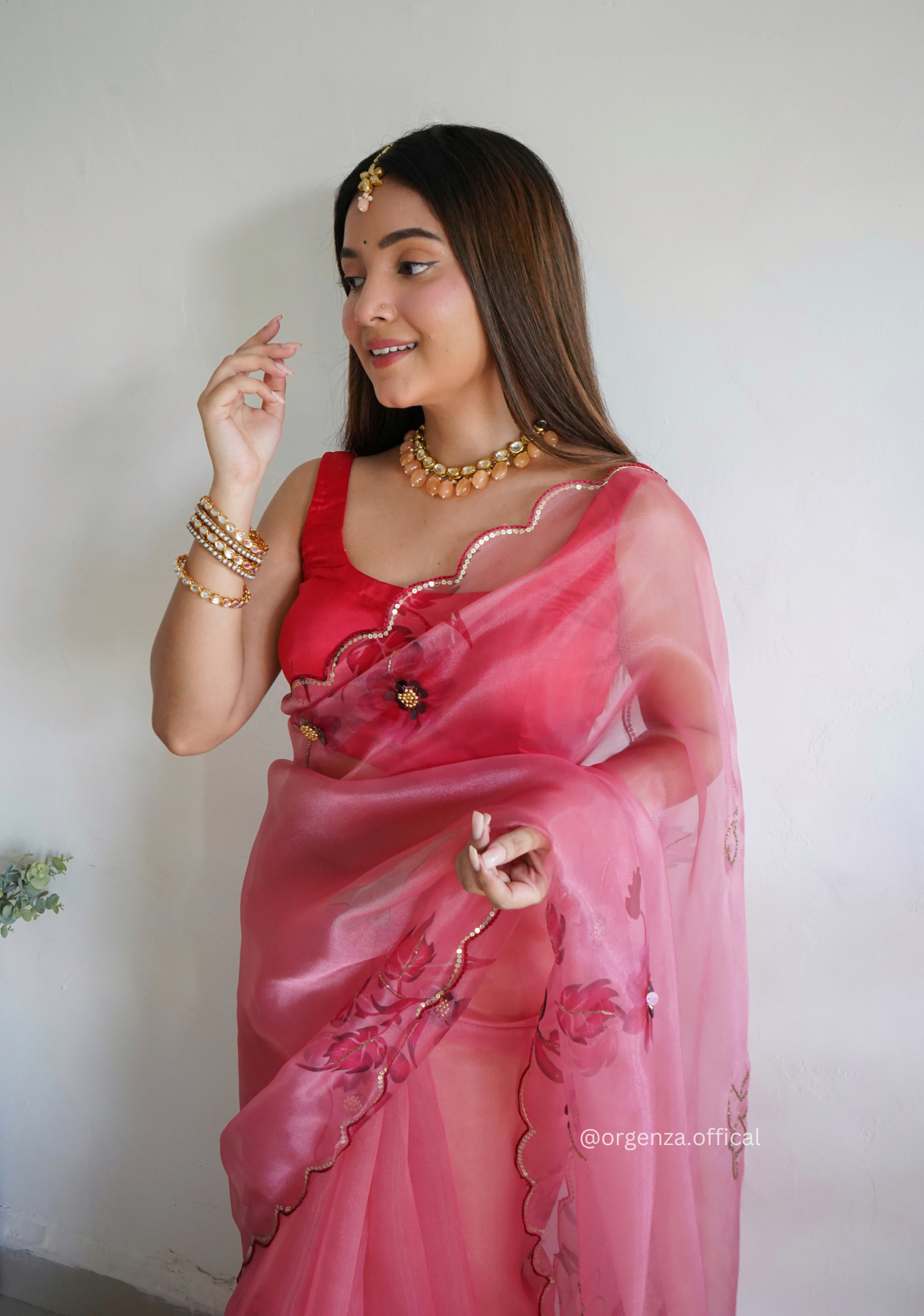 Orgenza Light Sky Color Pure Organza Silk And Flower Embroidery Work With Contrast Blouse