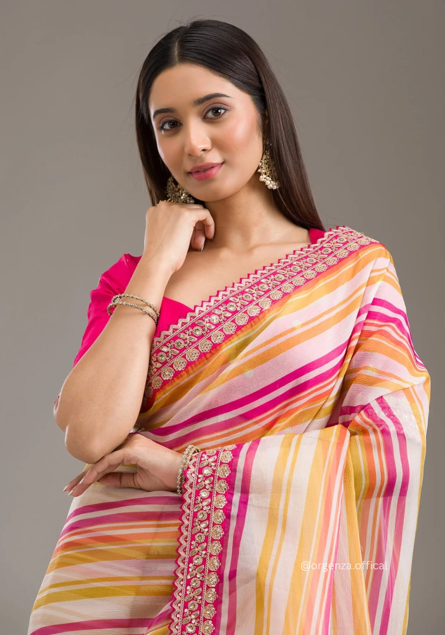 Pink Orange Colour Chinnon Silk Saree With Embroidery Work