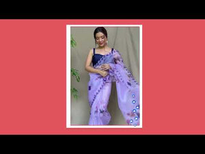 Orgenza Sky Purple Color Pure Organza Silk And Stone Work And Printed Flower Saree With Contrast Blouse