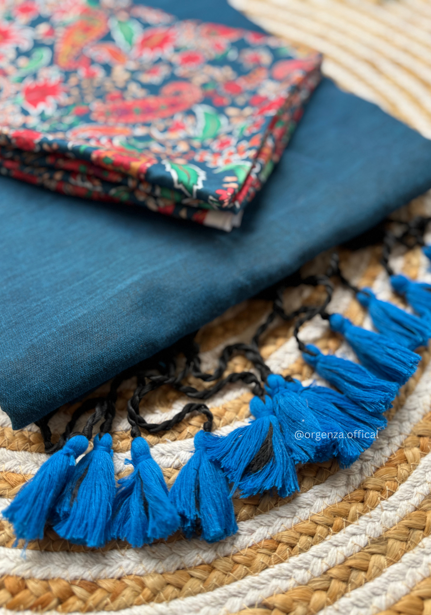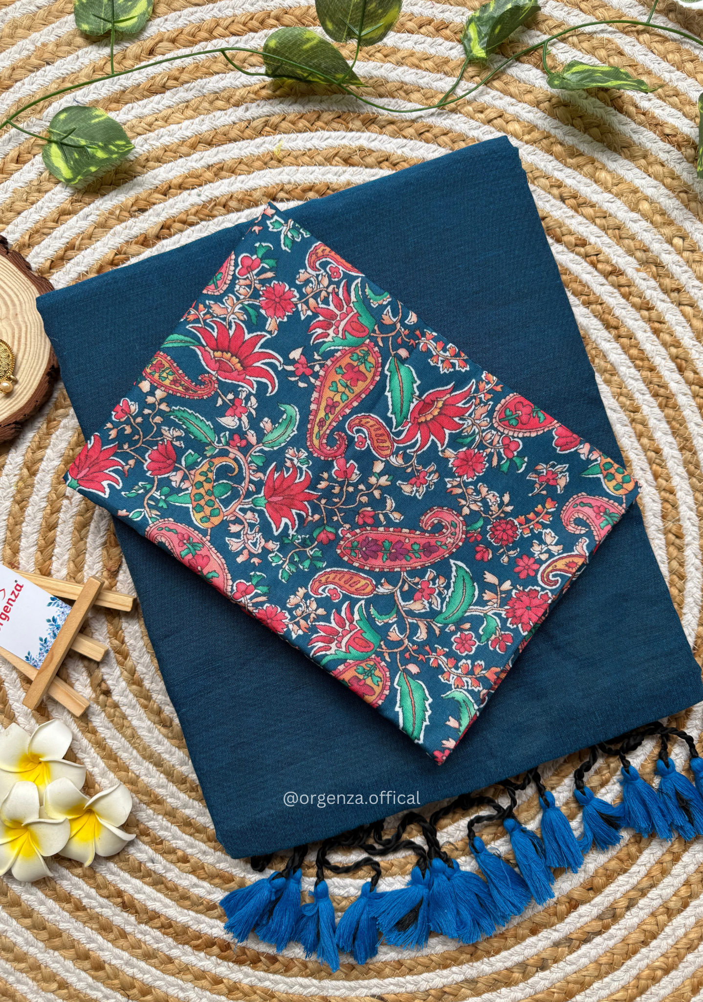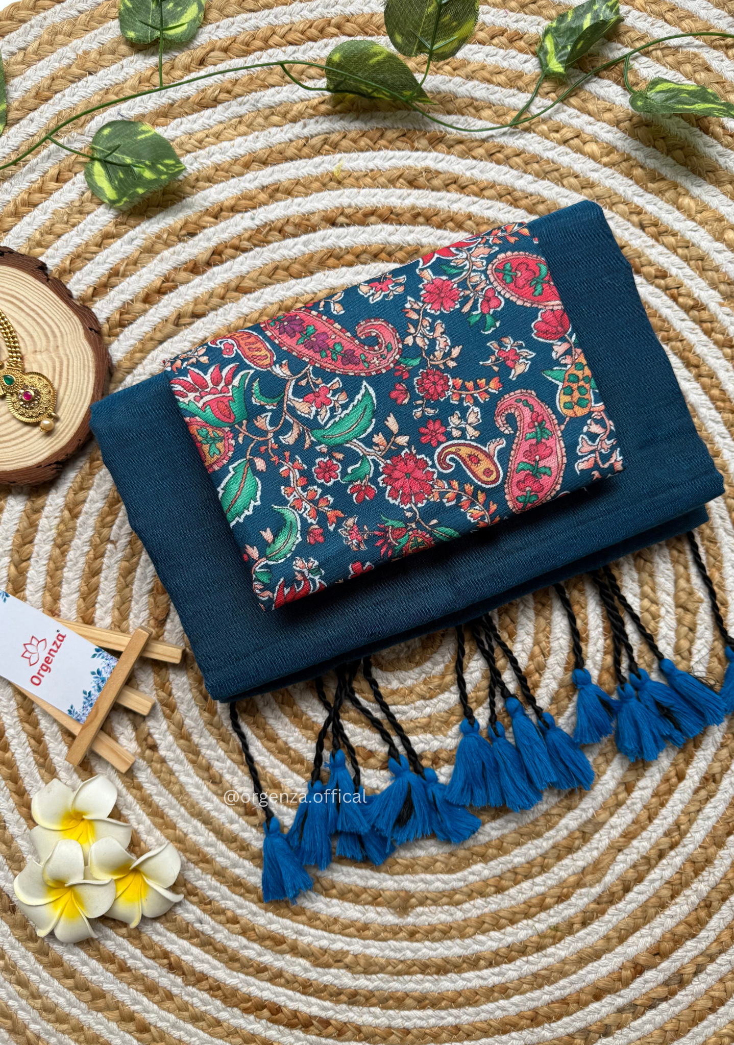 Rama Blue Colour Cotton Saree With Kalamkari Print Blouse