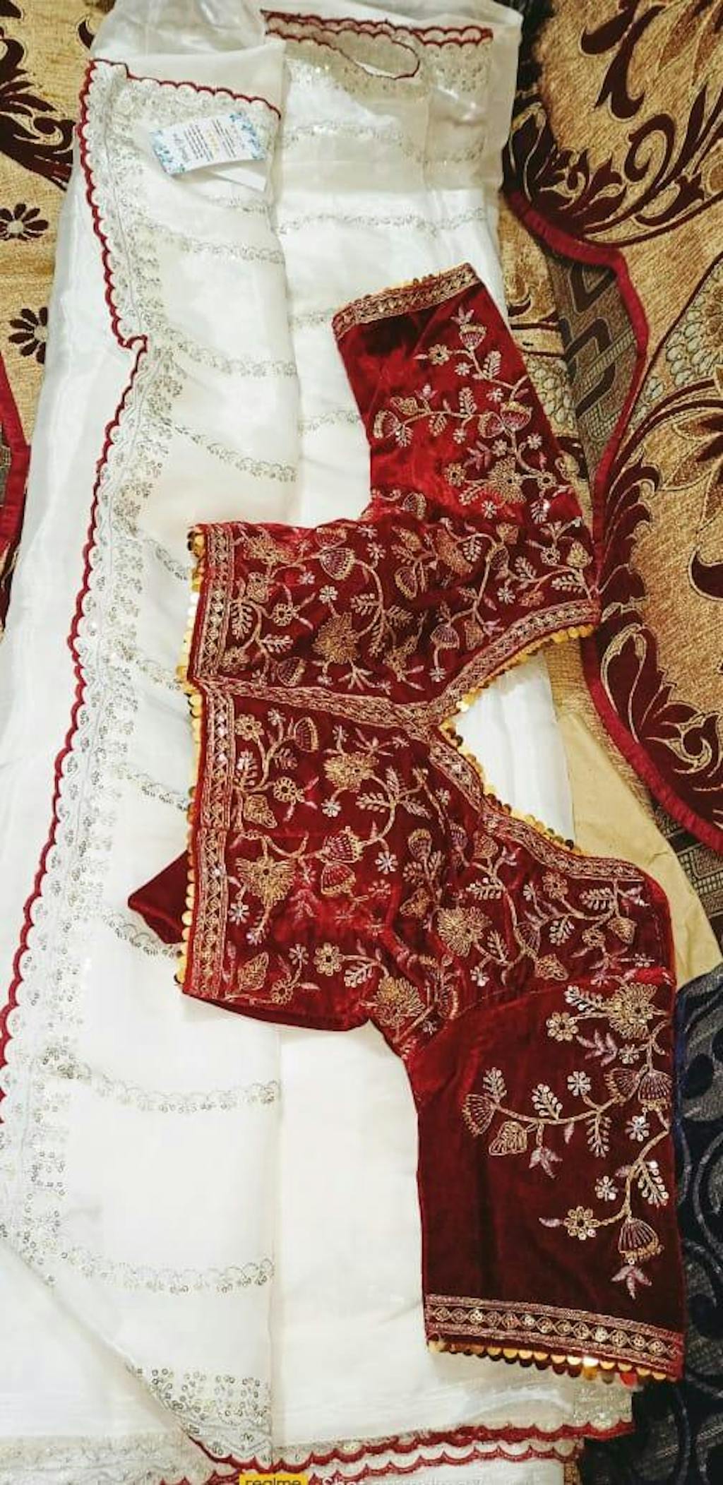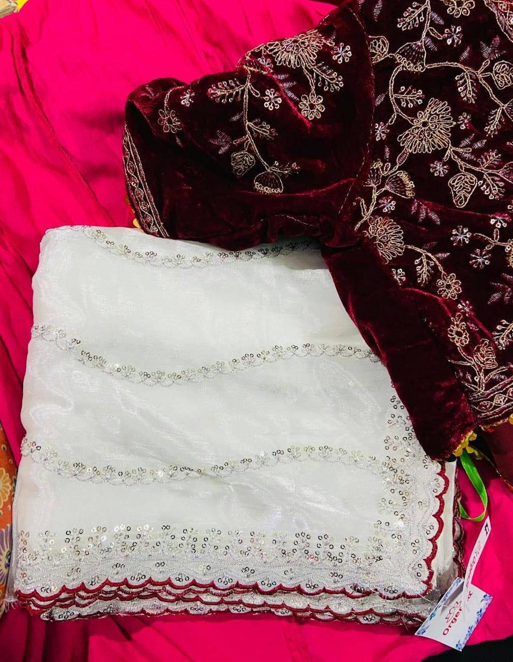 Paired with fully stiched embroidery sequence work 9000 velvet blouse with latkan.