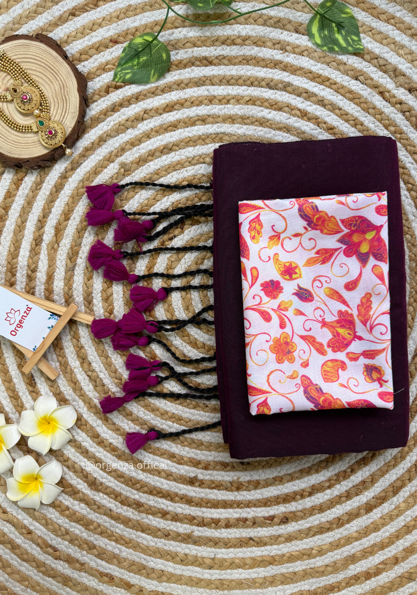 Wine Colour Cotton Saree With White Multi Print Blouse